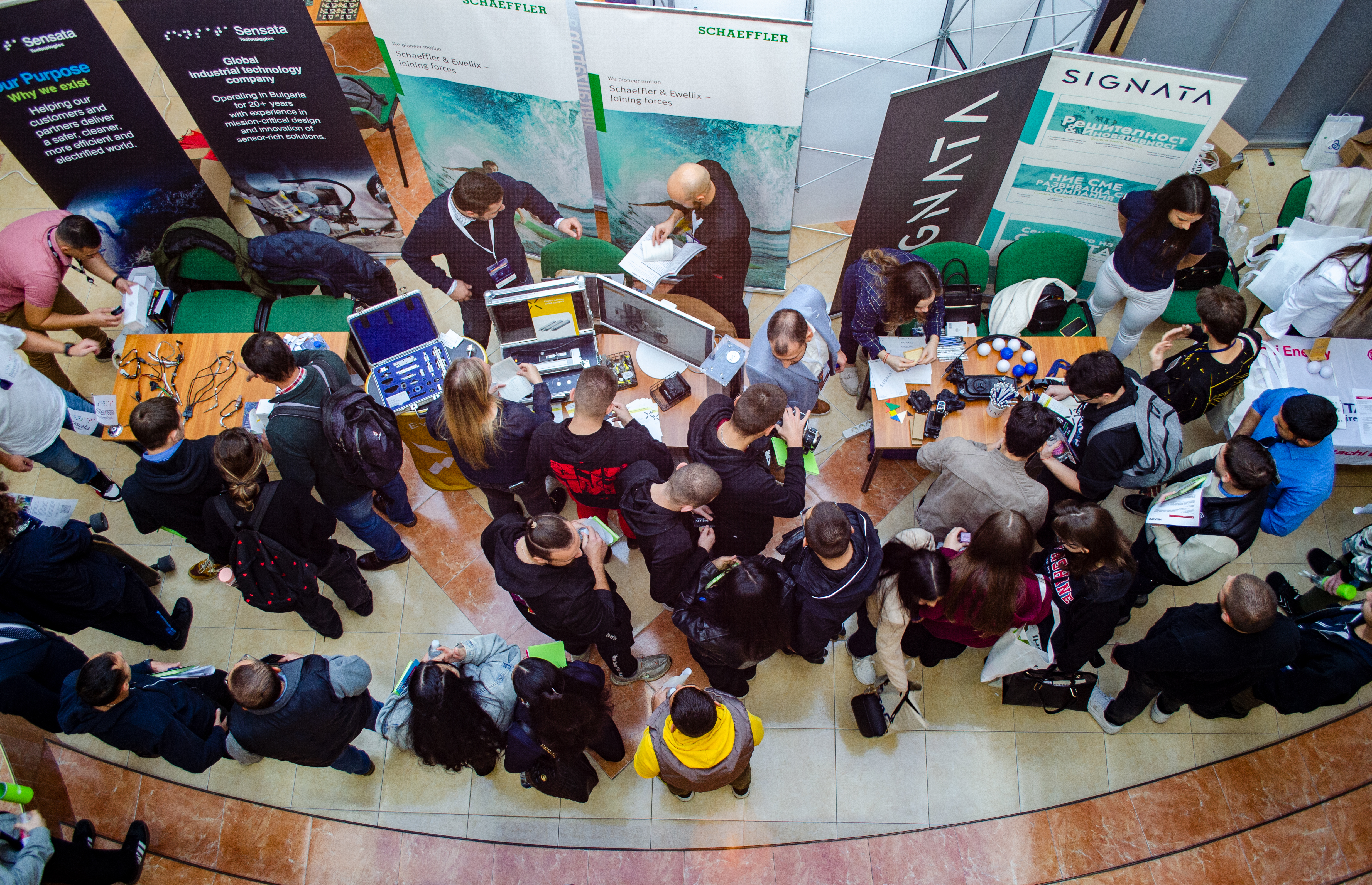 По време на събитието, студентите и участниците имаха възможност да се срещнат с представители на компании от различни сфери, включително информационните технологии, телекомуникациите, бизнес процесите (BPO), производството и технологичния сектор: