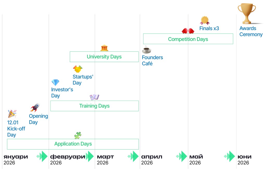 Конкурсната част ще се проведе в периода април – май 2026 г., а финалната церемония по награждаването ще се състои в началото на юни. Участниците ще имат възможност да спечелят достъп до менторство, стажове, професионални контакти, участия в събития и други награди, както и възможност за привличане на инвестиции.