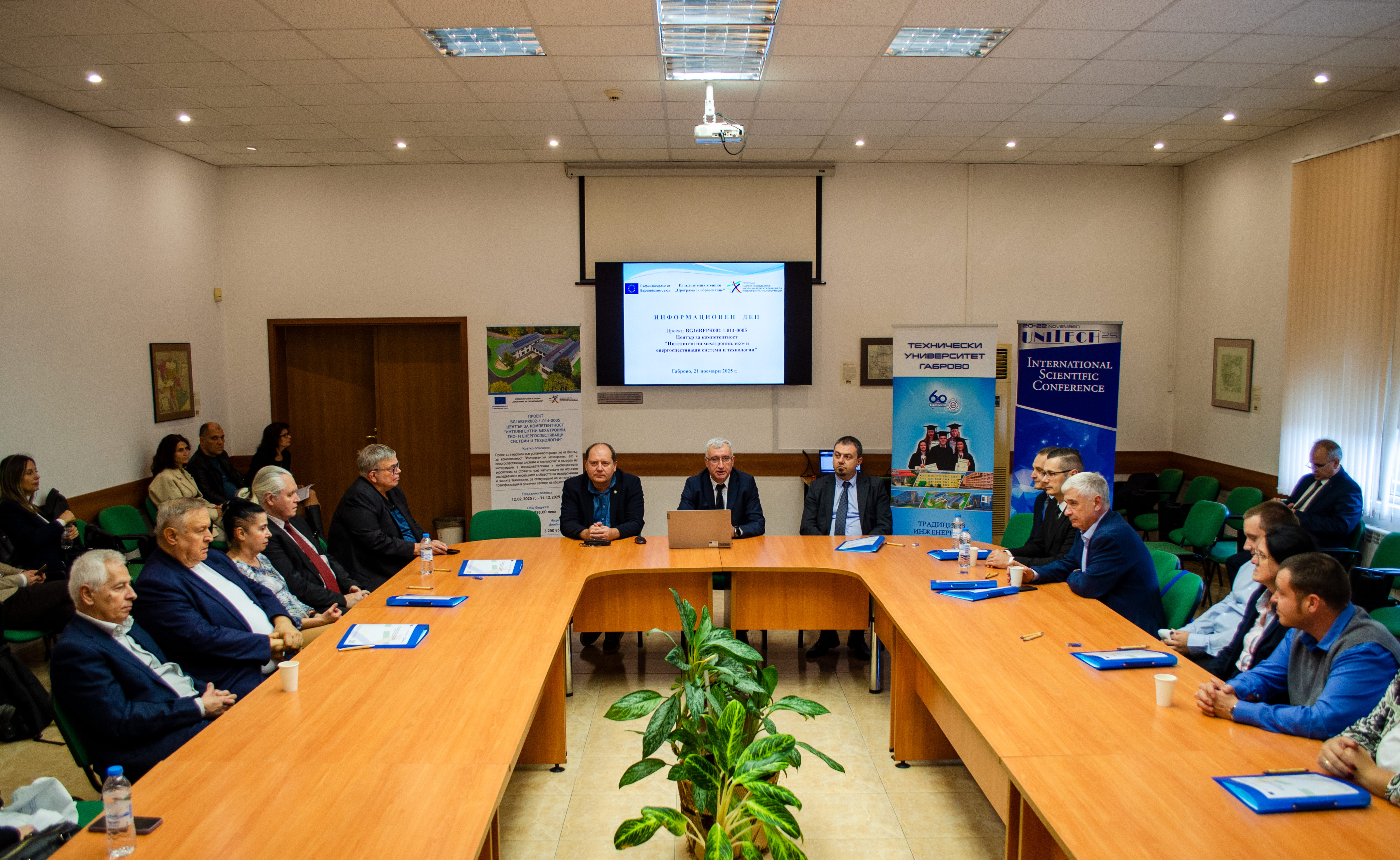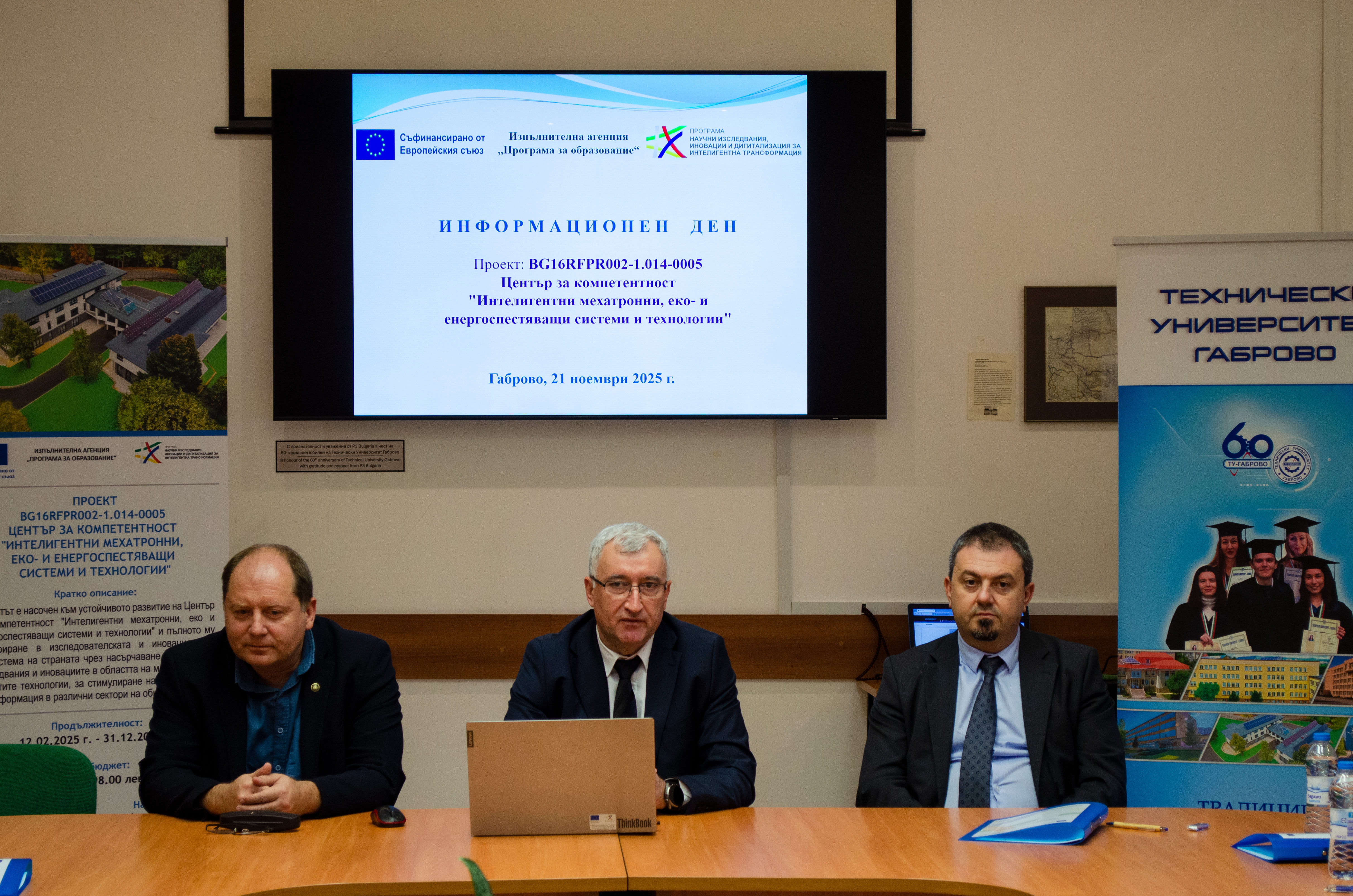 На 21.11.2025 г. в Технически университет – Габрово се проведе информационен ден за напредъка по проект BG16RFPR002-1.014-0005 Център за компетентност "Интелигентни мехатронни, еко- и енергоспестяващи системи и технологии“, финансиран от Програма „Научни изследвания, иновации и дигитализация за интелигентна трансформация“ 2021-2027 г. (ПНИИДИТ), съфинансирана от Европейския съюз чрез Европейския фонд за регионално развитие.