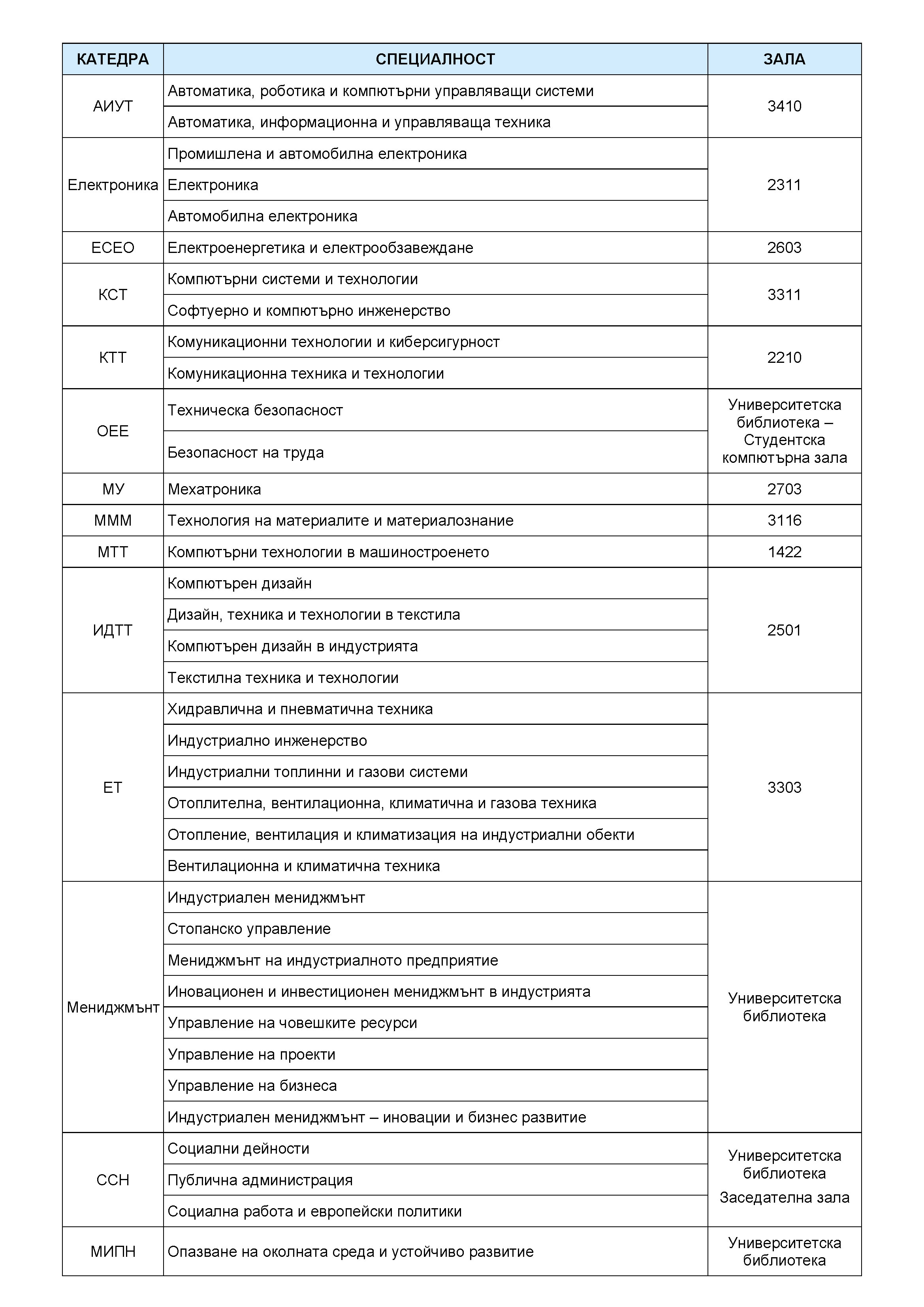 - Факултет „Машиностроене и уредостроене” – зала 3303 , сграда Ректорат;