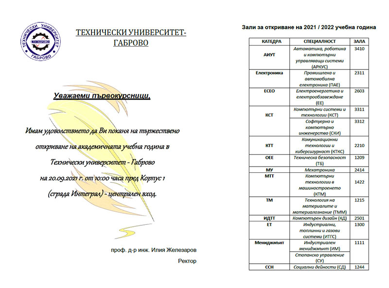 Академичното ръководство на Технически университет-Габрово кани всички свои студенти, преподаватели, служители и приятели на официално откриване на новата учебна 2021/2022 година, което ще се състои на 20 Септември 2021 г. (понеделник) от 10:00 часа пред Корпус 1 (сграда Интеграл) - централен вход.